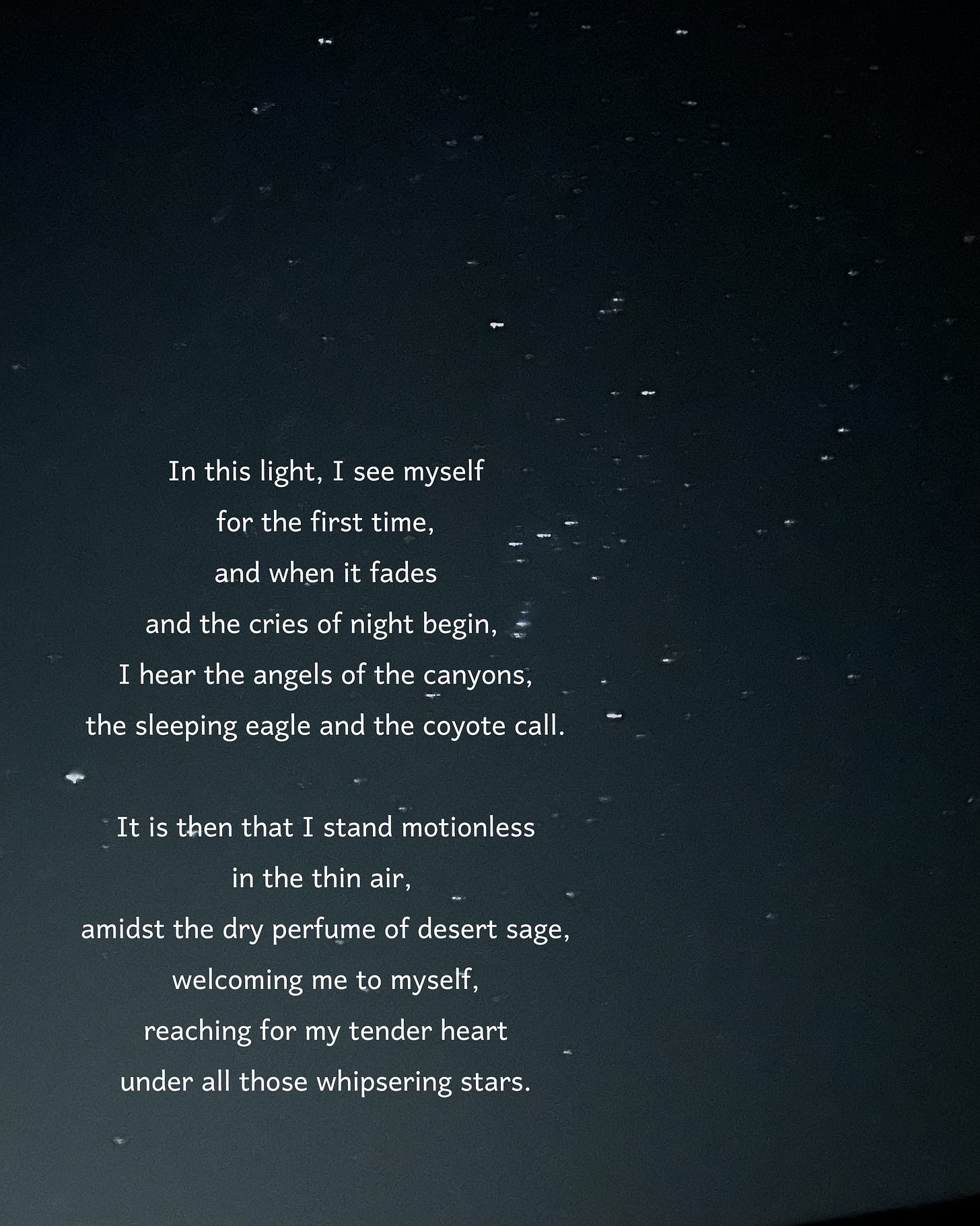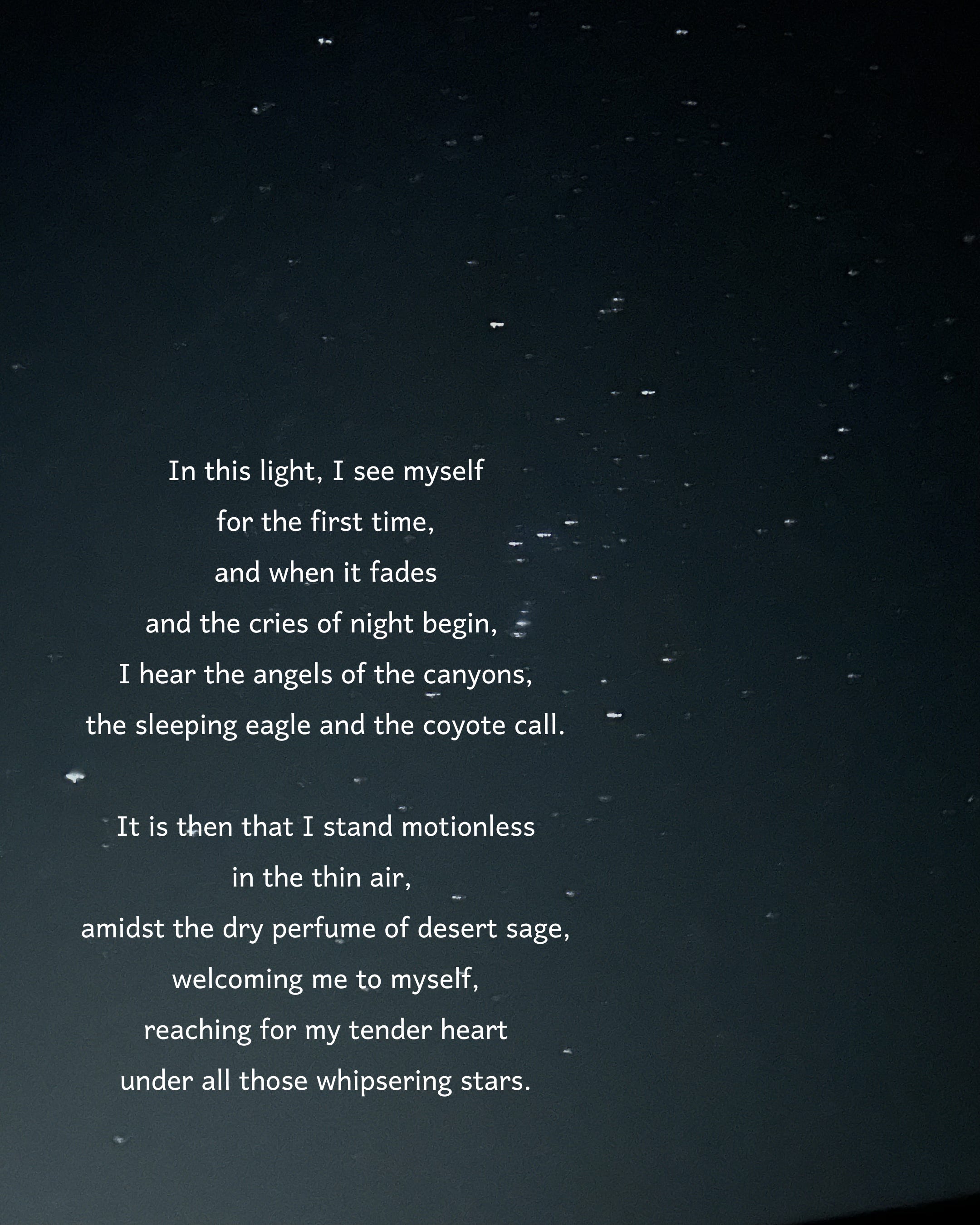 The desert landscape grounds you to the vastness of the human spirit, but the sky, yes, the desert sky is a prayer to the world.