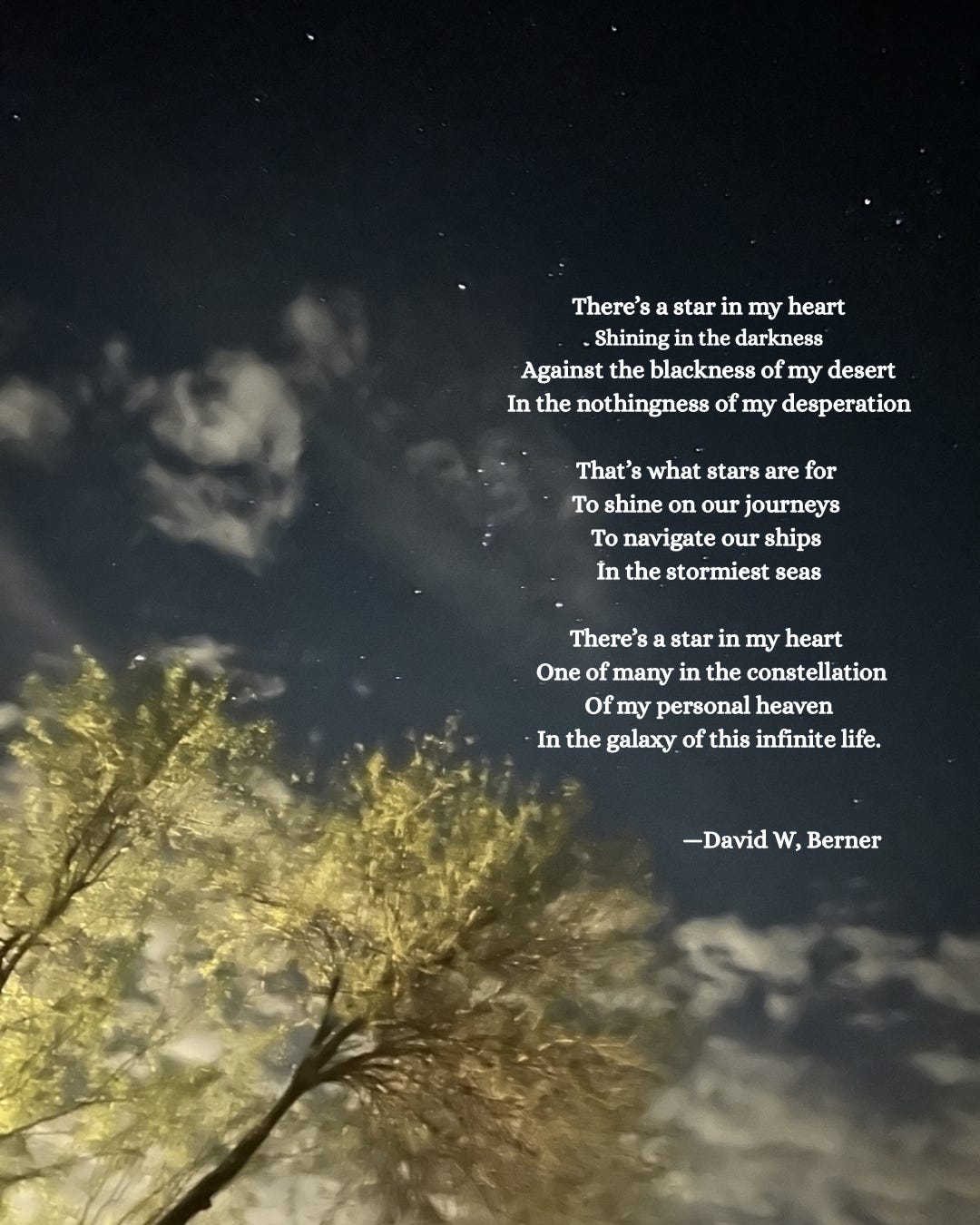 David W. Berner is the author of several books of award-winning fiction and memoir. His latest poetry collection, Garden Tools is available now from Finishing Line Press. He is the Poet Laureate of the Village of Clarnedon Hills, IL. and his novella, American Moon will be published by Regal House Publishing in September, 2026 and is currently available for pre-order.