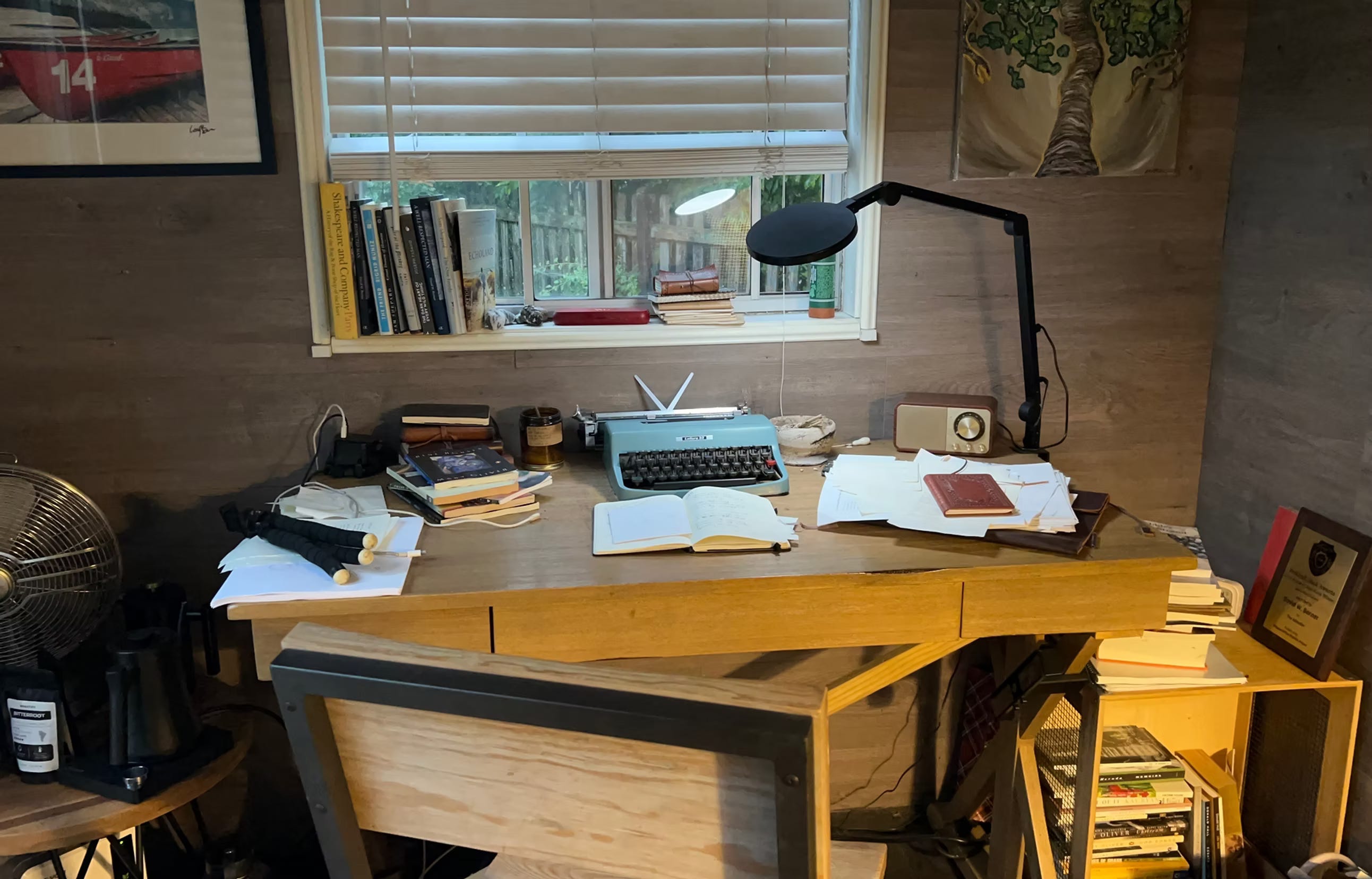 When first filling the space inside, I placed on my desk, a gift from Leslie—a small framed watercolor of Dylan Thomas’ desk in his writing shed inside the boathouse and garage along the rocks in Laugharne, Wales. Also depicted in the painting are pen and ink, journals, and scattered papers. The view is Thomas’ view, out the window to the Taf Estuary and Gower Peninsula. This painting and all the photos I have seen of the poet’s shed show the curtains open to the countryside, natural light pouring in. My view is north toward the wooden fence and the neighbor’s back lawn. At night when the sun is long gone, I can see mostly misshapen shadows—blacks and grays. Only a small, soft light shines from a neighbor’s patio and filters through a large pine at the border of the property, reflecting off the window and into my shed. It’s not enough to create a silhouette or warm the room, but it soothes nonetheless. There is no estuary or peninsula, but there is open space of a certain level, and I have given it permission to come inside.